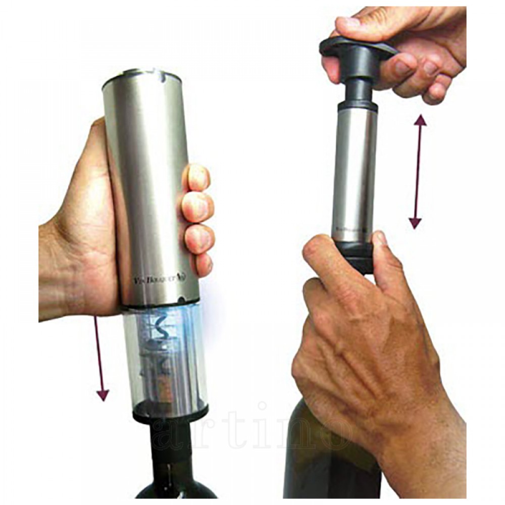 Noutatea acestui set consta in desfacator electric ce poate deschide pana la 40 de sticle cu o singura incarcare, fiind prevazut cu un led de culoare albastra pentru vizualizarea indicatiilor. Desfacatorul nu este prevazut cu niciun buton. Pur si simplu se plaseaza gadgetul peste dop si se apasa. Porneste automat si extrage dopul in doar cateva secunde. Setul este insotit de o baza suport pentru reincarcarea desfacatorului. Ajuta la depozitarea compacta a celor 5 accesorii. Este prezentat intr-o cutie cadou cu fereastra transparenta.